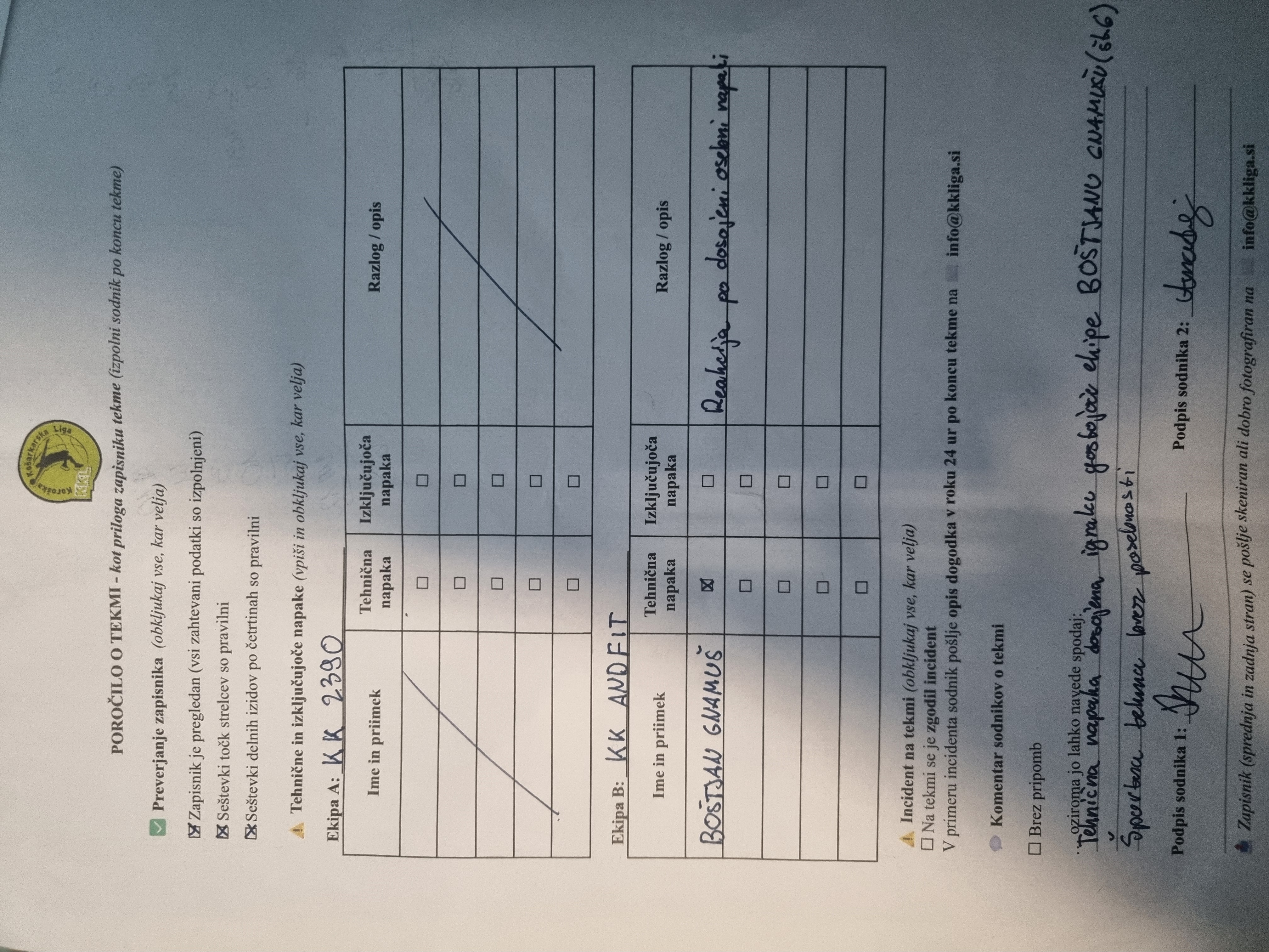 Boštjan GNAMUŠ (KK Andfit) – tehnična napaka: reakcija ob dosojeni osebni napaki.