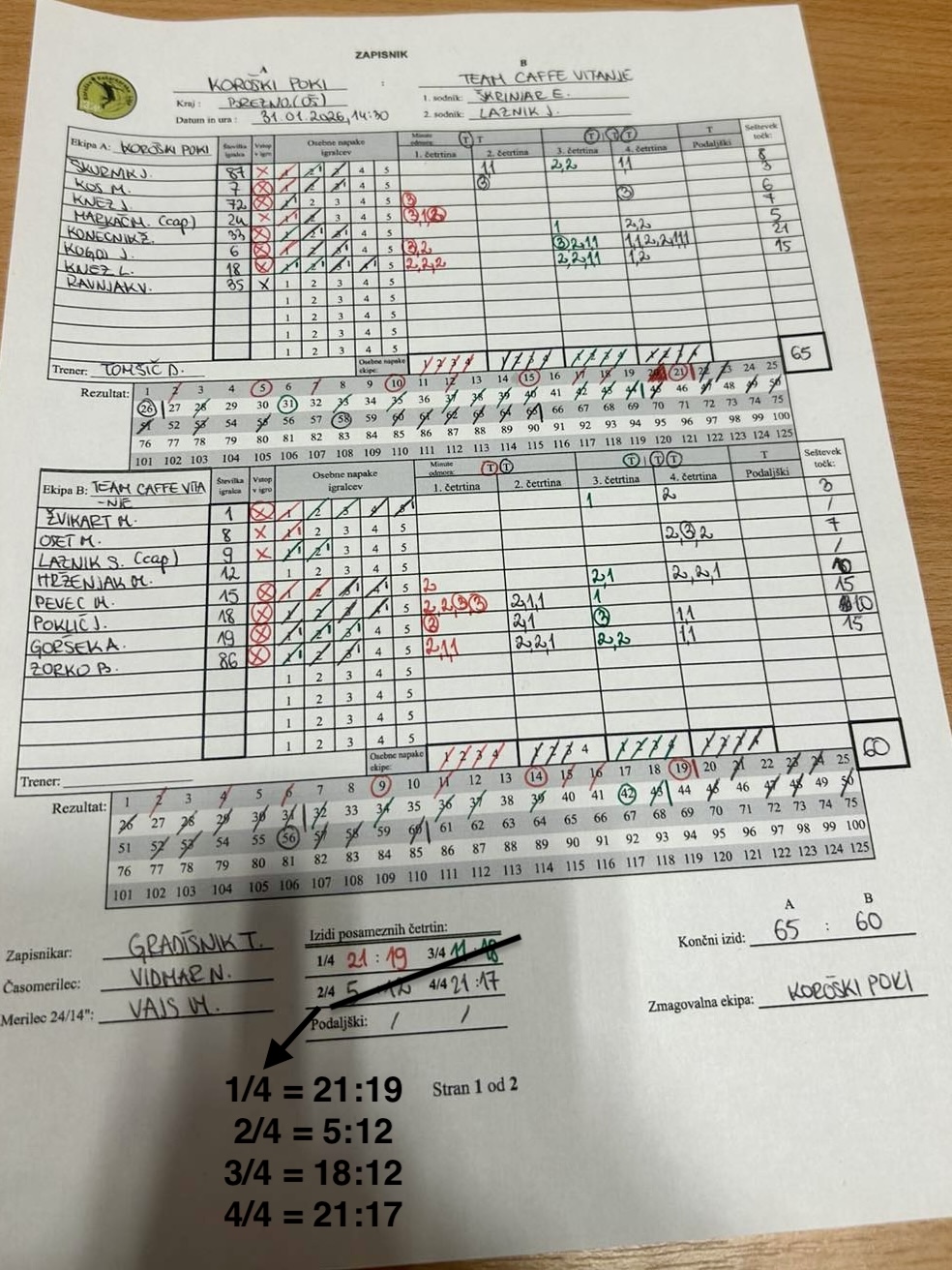 | KK Team Caffe Vitanje | 19 | 12 | 12 | 17 | 60 |